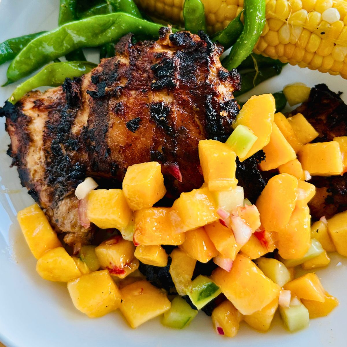 Delicious fresh peach salsa soothes the tangy bite of the chicken!